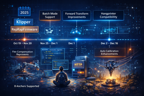 On Dec 1 2025 Klipper got the remaining parts of Hangprinter support that only ReprapFirmware had before (buildup compensation, block-and-tally style gearing, etc).