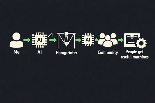 So I'm adapting the Hangprinter Project to the AI future. In 2024 I wanted to automate the whole Hangprinter Project, starting with support agents (see hp-support and Hangprinter Knowledge Hub). In 2025 my focus has shifted from "automate the Hangprinter Project" to "insert Hangprinter into the new age". AIs are not independently self-improving yet, so neither is Hangprinter.