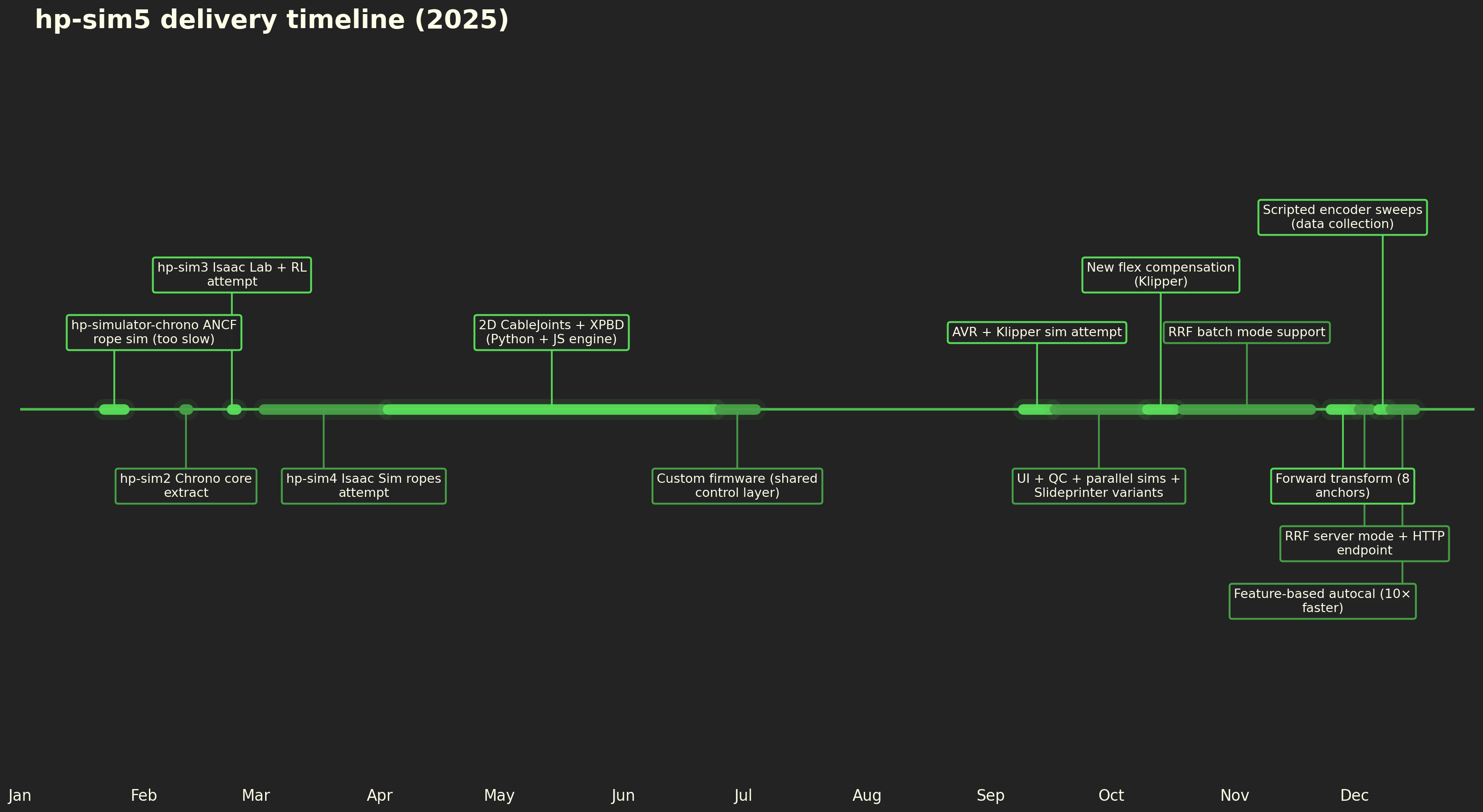 All of this work, from Jan 22 to today (Dec 17) was greatly sped up by various AI tools but also by the simulation itself. Being able to test things right in the simulation has made experiments 10x cheaper, faster, and more pleasant. I've literally run hundreds of experiments that helped my understanding of Hangprinter's software and mechanics, each of which would have either been impossible or taken at least one day to do physically.